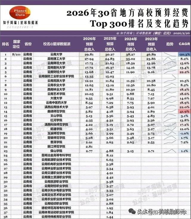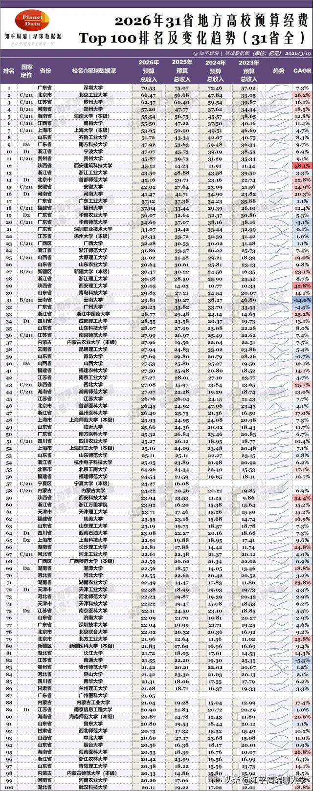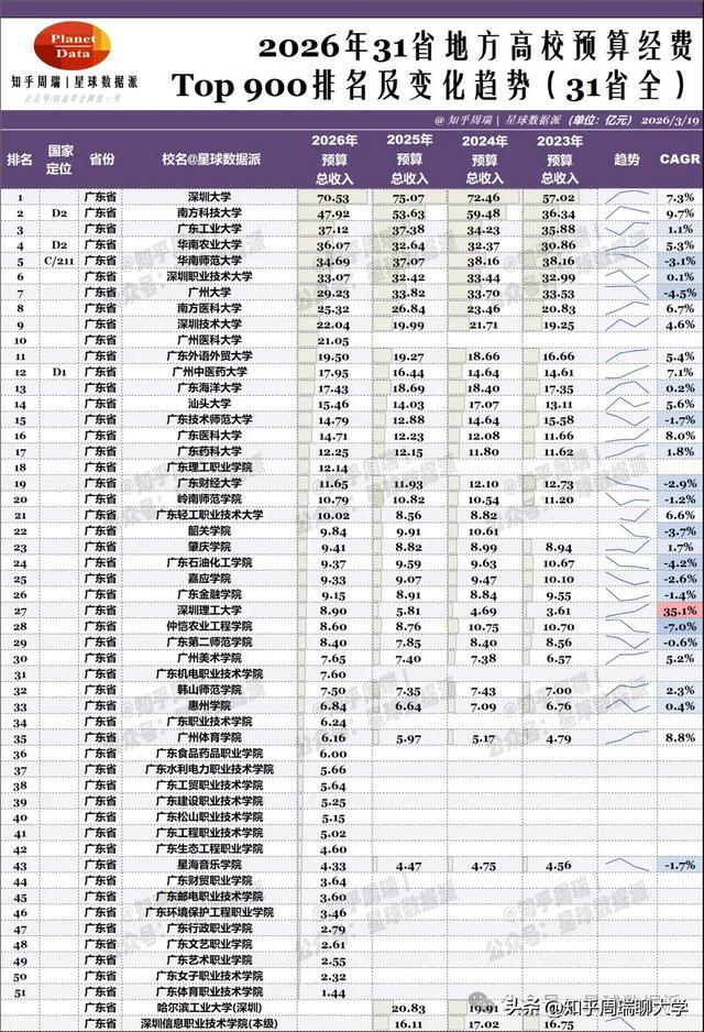 负增长预警: 华南师范大学-3.1%、云南大学-14.0%(云南大学未进前30,但在之前数据中出现过)、华南农业大学增速仅5.3%、广东工业大学仅1.1%——这些广东高校的增速放缓,与深圳大学2026年预算回落一起,可能预示着广东高教投入进入平台期。毕竟,蛋糕再大也有限,当全省高校预算总额不再高速增长时,内部的结构性调整就会发生。