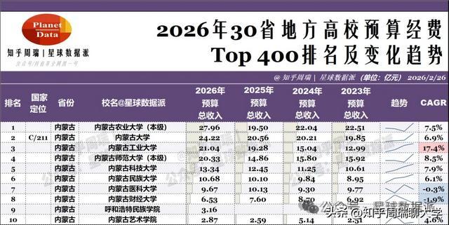 真正的戏剧性变化发生在第二名。北京工业大学以66.47亿的预算从去年的第11位直接跃升至第2位,一举超越苏州大学。这一跃升绝非偶然——26.2%的四年复合增长率,在前十强中仅次于西安建筑科技大学。作为北京市属高校的“独生子”,北工大近年来在集成电路、人工智能等领域的布局与国家战略高度契合,北京市也持续加大对其投入。从2023年的33.05亿到2026年的66.47亿,三年翻了一番,这种增速足以让任何高校侧目。北工大的崛起,标志着直辖市属高校在地方财政支持下的“逆袭”路径。