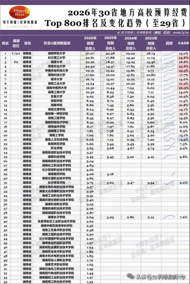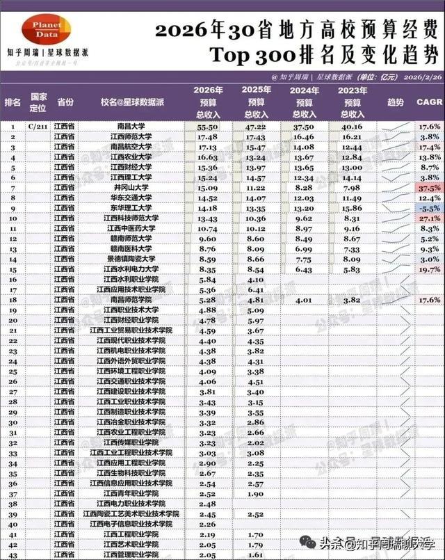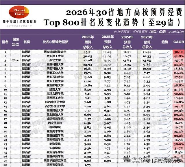 增速之王:西安建筑科技大学以58.1%的复合增长率领跑全国。从2023年的11.44亿到2026年的45.21亿,三年增长近34亿。这种“火箭式”增长,与近年来国家基础设施建设和城市更新战略密切相关,也反映了陕西对省属高校的投入倾斜。同城的西安理工大学同样以42.8%的增速位列前30,两校的强势表现让陕西在前30中占据两席。