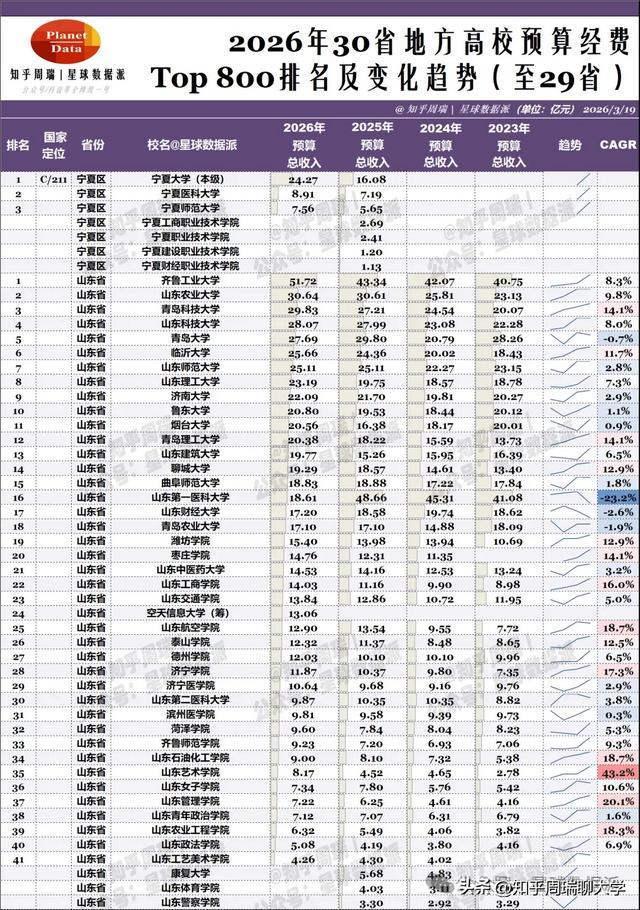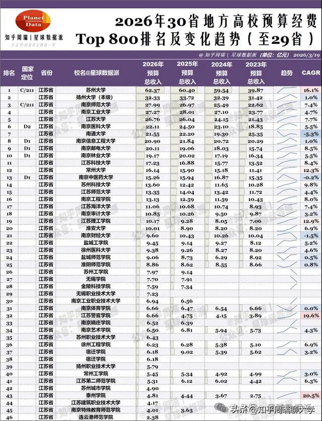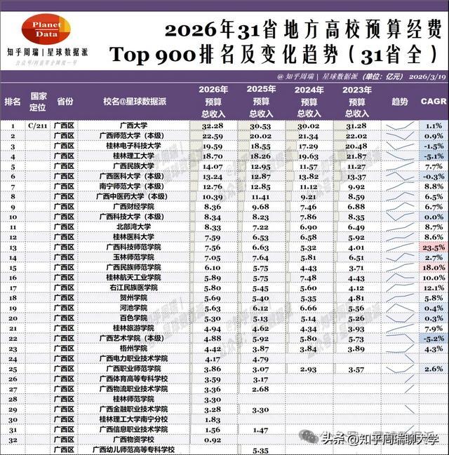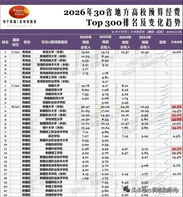 山东则有齐鲁工大(8)、山东农大(26)、青岛科大(30)三所闯入前30强。江苏有2所(苏大、扬大),北京2所(北工大、首师大),河南2所(郑大、河大),陕西2所(西建大、西理工),其余省份各1所。这种分布,既体现了经济强省的财力厚度,也展现了中西部省份“集中资源办大事”的战略选择。新疆大学30.47亿、广西大学32.28亿、贵州大学45.87亿——这些西部高校的预算规模,已经与部分东部省属高校持平甚至超越,折射出国家对西部高等教育的战略倾斜。