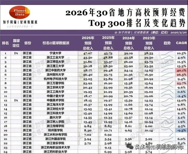 浙江以4所(宁大、浙工大、浙师大、浙理工)紧随其后,形成“浙家军”集团。宁波大学47.07亿、浙江工业大学43.50亿、浙江师范大学31.86亿、浙江理工大学30.18亿——这四所高校的预算梯度清晰,展现了浙江“多点开花”的投入哲学。浙江的经济实力正在通过教育预算转化为“体系性优势”,不追求某一所高校的鹤立鸡群,而是让整个梯队集体站上高地。