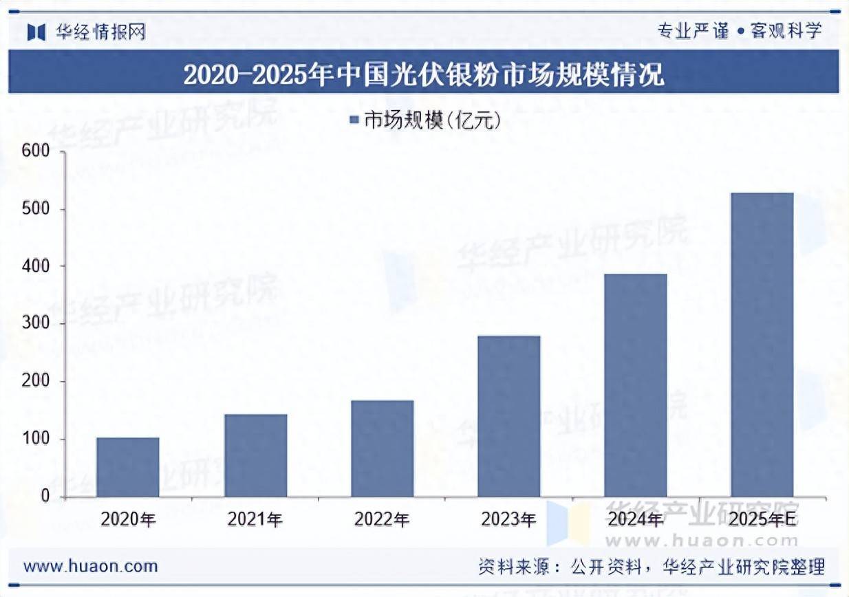 光伏银粉是硝酸银的主要应用领域之一,其质量直接影响太阳能电池的光电转换效率,伴随着光伏行业的快速发展,硝酸银在光伏银粉中的应用需求持续增长。按销售收入计,2024年中国光伏银粉市场规模约为387亿元。